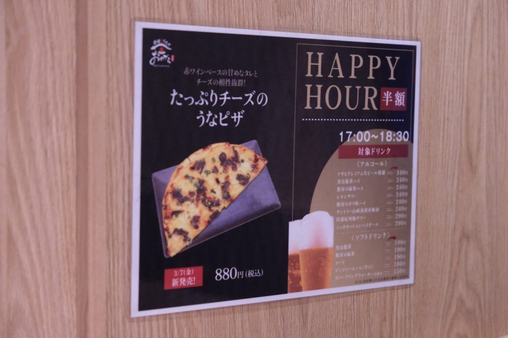 何とHAPPY HOURを展開しているようで、”チーズ×うなぎ”という魅惑の「うなピザ」と、17:00〜18:30まで対象ドリンクが半額て飲めるというかなりお得な企画でした!