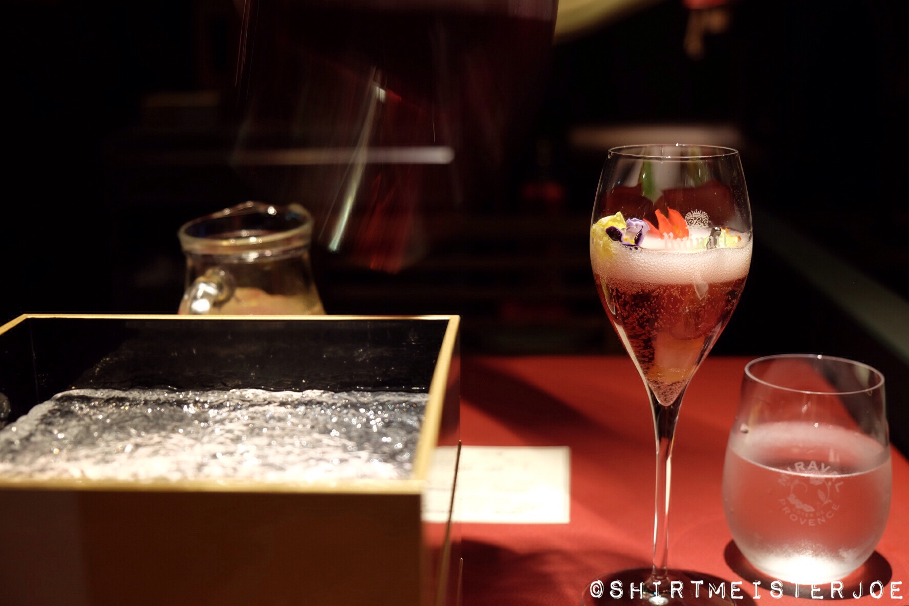 箱の中には食用花と串に果物が飾られグラスに投入しそこにドリンクをサーブされ食前酒の葡萄のキールロワイヤル風な何とも洒落っ気を感じさせる提案が。これ女の子連れてきたらアガるでしょ?