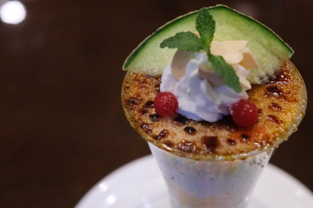 『メロン&ココナッツのブリュレパフェ』は、皮つきメロンをトッピングし、メロンの果肉は勿論ですがメロンアイスやメロンジュレを層にして、バニラ、ココナッツアイスなどグラスに美味しいが詰まった内容に。