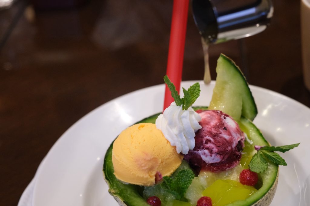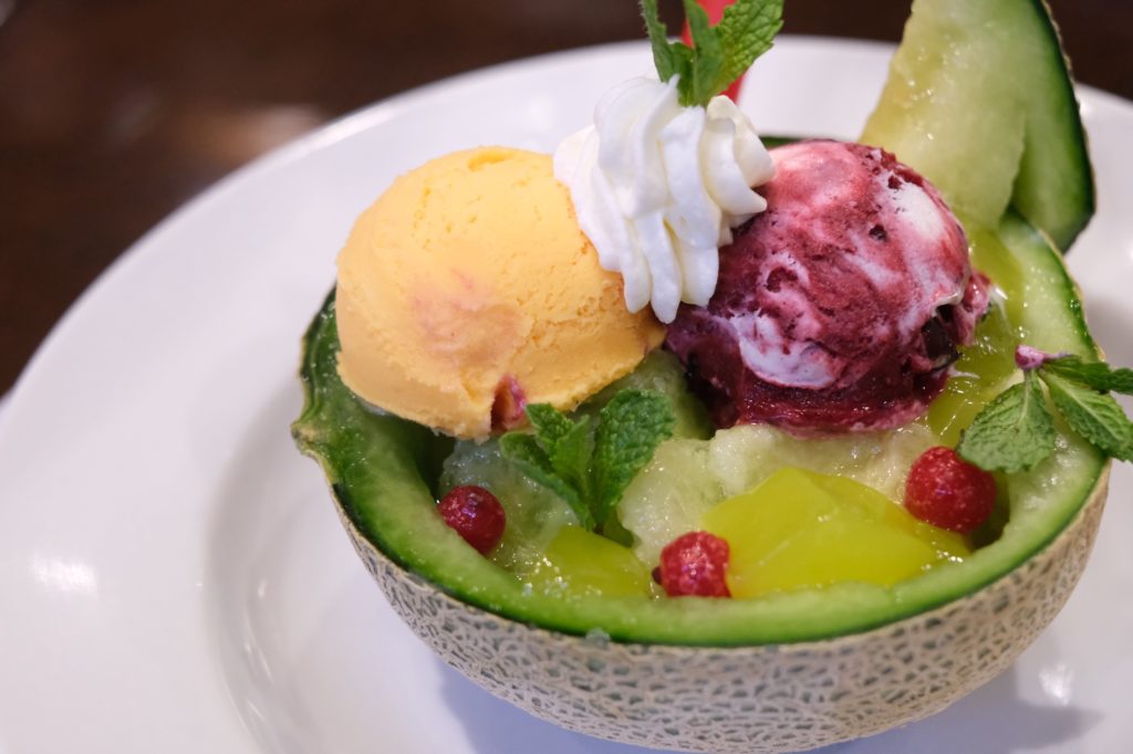これまた豪快に皮つきメロンが乗せられ甘さ控えめのホイップクリームやバニラアイスをトッピングしています。
