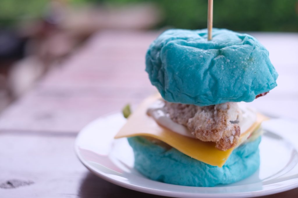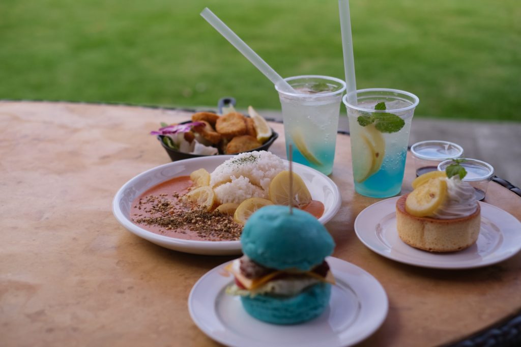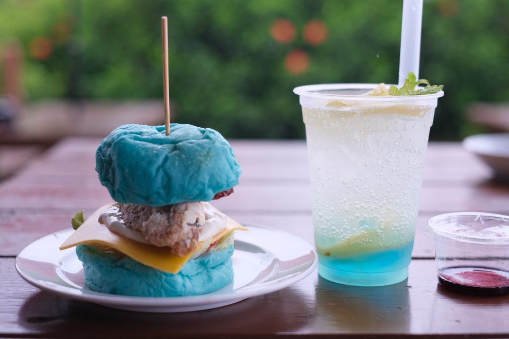 - 初島バーガー:青いバンズに鯖の唐揚げとレモンをサンドしたインパクト抜群の一品。