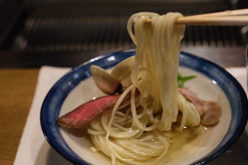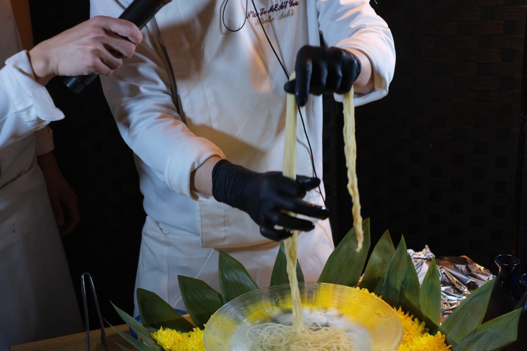 ラーメンシェフとのコラボで生まれた一杯で、パフォーマンスも含めて目の前で仕立てたばかりの出来立てつけ麺の満足度はかなり高い。