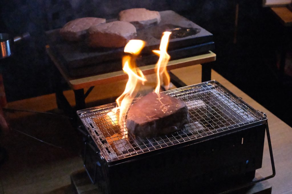 驚く程に厚切りカットされたシャトーブリアンに炎が纏う情景はまさに圧巻の一言!
