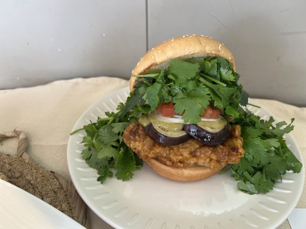 一方パクチーチキンバーガー グリーンカレーは、チキンは同様にココナッツミルクと青唐辛子の甘辛スパイシーのバランスが秀逸なソースに、揚げナスとトマト、スライスオニオンをトッピングしています。