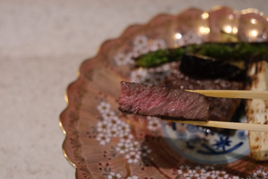 熟成によって赤身の旨みが凝縮し、脂の旨みが際立った迸る肉汁が印象的な事に加え、断面の美しさからも火入れの絶妙感が見て取れます。