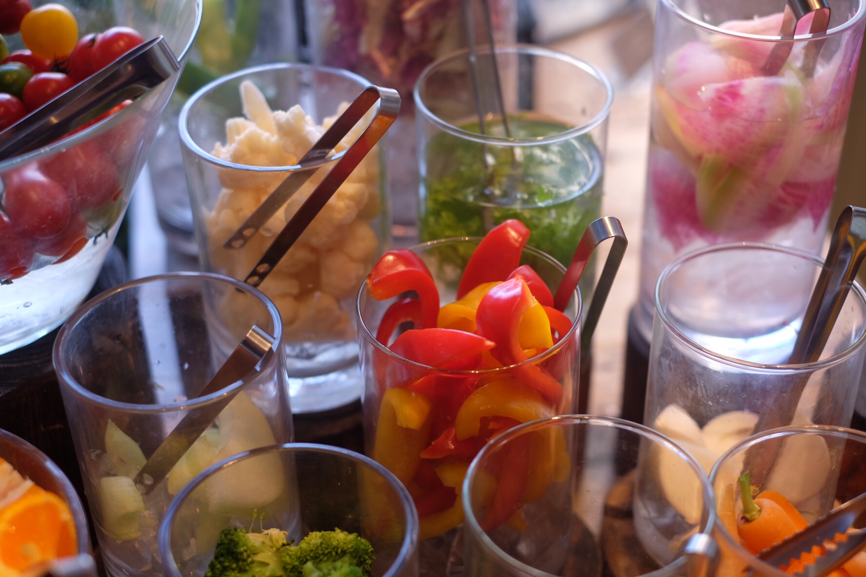 カウンターには色どり鮮やかな野菜類が並ぶ名物のクリーンイーティングビュッフェが。